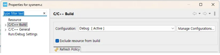또한, 힙 관리를 위한 sysmem.c가 있습니다. 이 프로젝트의 경우 FreeRTOS는 자체 힙 관리 코드를 제공합니다. 동적 메모리 할당을 처리하는 코드입니다. 그래서 이 프로젝트에는 이 sysmem.c가 필요하지 않습니다. 따라서 해당 파일을 마우스 오른쪽 버튼으로 클릭하고 Properties를 선택한 다음 "exclude resource from build" 옵션을 체크할 수 있습니다.