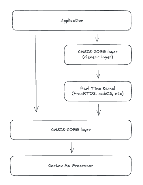 그리고 CMSIS-CORE 레이어도 있습니다. CMSIS-CORE 레이어는 다시 Cortex-M 프로세서 기반 주변 장치를 다루기 위한 표준화된 API를 제공합니다.