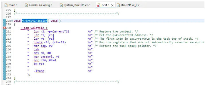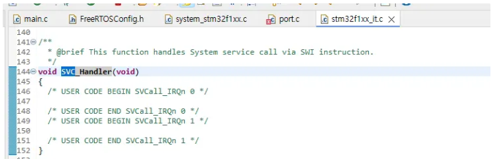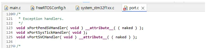 FreeRTOS 커널은 내부적으로 하드웨어 인터럽트를 다룰 때 자신만의 함수 이름을 사용합니다. "vPortSVCHandler, xPortPendSVHandler, xPortSysTickHandler". port.c 파일을 보면 확인할 수 있습니다.
