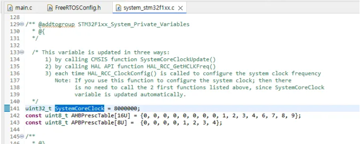 그리고 나서 configCPU_CLOCK_HZ을 SystemCoreClock을 가져와서 사용하고 있네요. 이렇게 하면 HAL이 자동으로 관리하고 있고, PLL이 변경돼도 안전합니다. 이 방식이 훨씬 좋겠죠?
