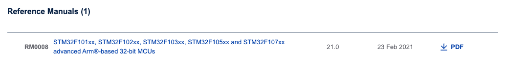 먼저 마이크로컨트롤러와 관련된 문서를 다운로드해봅시다. 구글에서 마이크로컨트롤러 부품 번호, 예를 들어 "STM32F103RBT6"를 검색해서 ST 웹사이트에 접속합니다. Resources로 이동합니다. Resources로 가면 데이터시트를 다운로드할 수 있습니다.