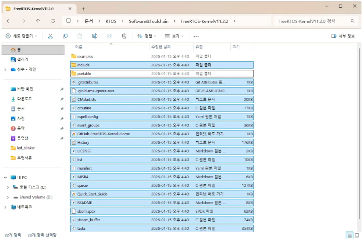 이제 위에서 확인한 FreeRTOS 커널 소스를 복사해야 합니다. 전부다 복사하지는 마시고, 필요한 것들만 복사해서 사용하도록 합니다.
