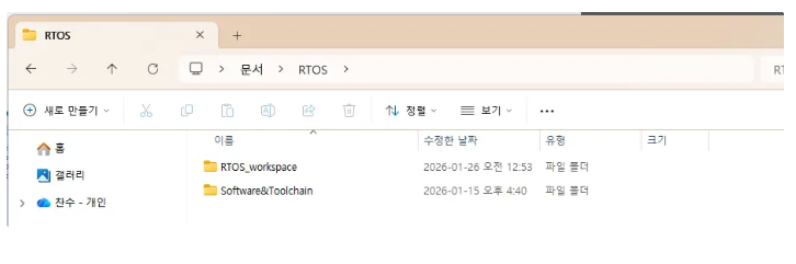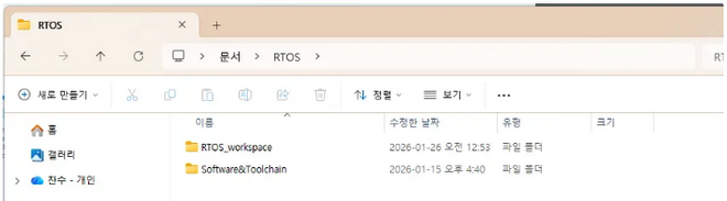 PC에서 아무 드라이브에나 폴더 하나를 만드세요. 저는 문서에다가 RTOS 폴더를 하나 만들었습니다. 그리고 그 아래에다가 RTOS_workspace와 Software&Toolchain 이란 폴더를 만들었습니다.