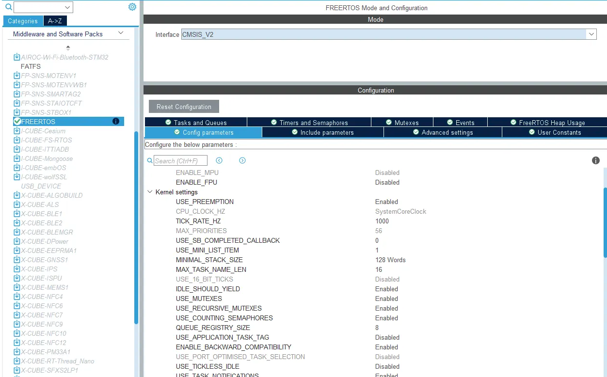이제 CMSIS RTOS v1, 즉 버전 1로 작업할 것인지 아니면 CMSIS RTOS 버전 2로 작업할 것인지 인터페이스를 선택해야 합니다. 여기서 CMSIS_v2를 선택하면 많은 탭으로 구성된 이 구성 창이 나타나며, 이를 사용하여 RTOS를 구성할 수 있습니다.