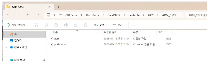 ARM_CM3 안에 들어가보면 두 개의 파일이 보입니다. 하나는 소스 파일이고 다른 하나는 헤더 파일입니다. 이것들은 실제로 포트 코드 또는 아키텍처 레벨 코드이며, FreeRTOS가 우리의 프로세서 아키텍처에서 실행되기 위해 필요합니다.