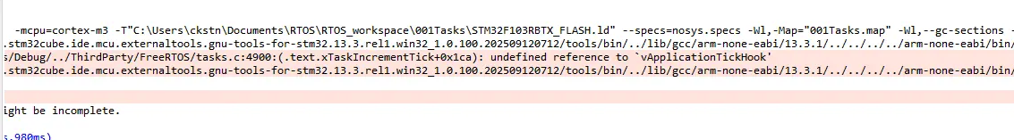 여기서 핵심은 "undefined reference to 'vApplicationTickHook'" 입니다. FreeRTOS 내부(tasks.c)에서 vApplicationTickHook()을 호출하려고 했는데 사용자 코드에 그 함수가 존재하지 않아서 생기는 에러입니다. 즉, 선언만 있고 구현이 없습니다.