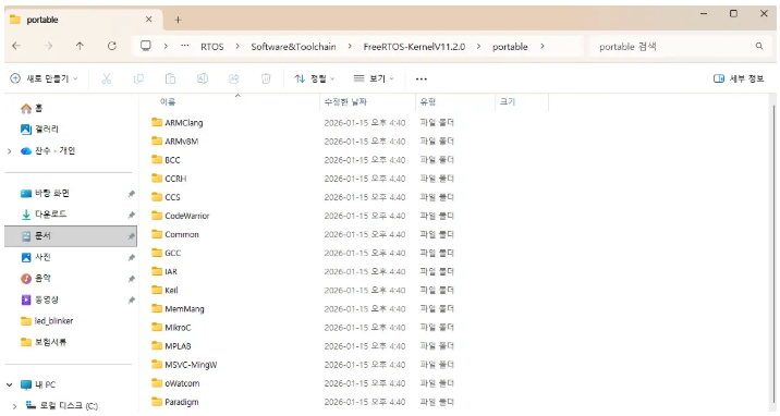 FreeRTOS는 수많은 CPU 아키텍처에서 돌아가야 하므로, CPU 마다 다른 하드웨어 설정(어셈블리 코드 등)을 이 폴더에 따로 모아두었습니다.