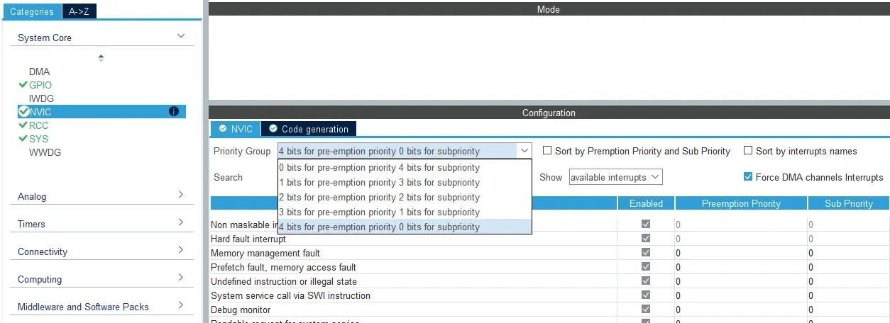 그 후, NVIC로 가서, 여기서 할 일은 여기 Priority Group 으로 가서 이것을 preemption priority에 4비트, sub priority에 0비트로 변경하는 것입니다.