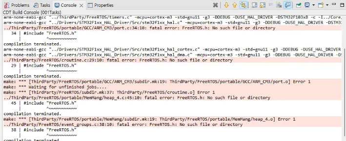 이제 컴파일을 시도해봅시다. 무슨 일이 일어나는지 봅시다. 여기 보시면 FreeRTOS.h를 찾을 수 없다고 합니다.