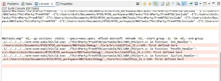 이제 코드를 빌드해보세요. 프로젝트가 성공적으로 빌드되어야 합니다. FreeRTOS 커널을 STM32 프로젝트에 통합하는 작업을 거의 완료했습니다.