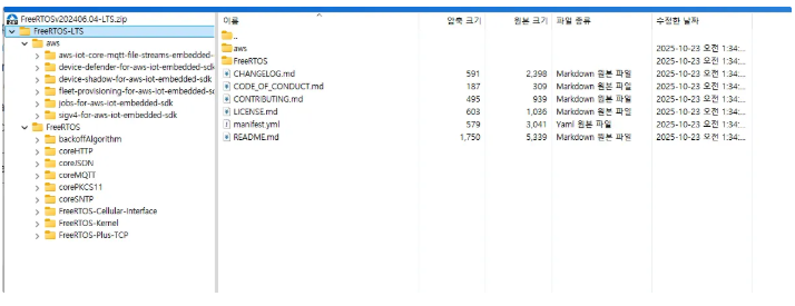 예전에는 커널만 별도로 다운로드 받을 수 있었던거 같은데 지금은 없네요. FreeRTOS LTS를 다운로드 받으면 기본적으로 커널 외에도 TCP/IP, MQTT, OTA, 라이브러리 등 AWS 클라우드 연결에 필요한 핵심 라이브러리들이 세트로 묶여 있습니다. 이걸 다운로드 받아서 커널만 사용할 수 있긴 합니다.
