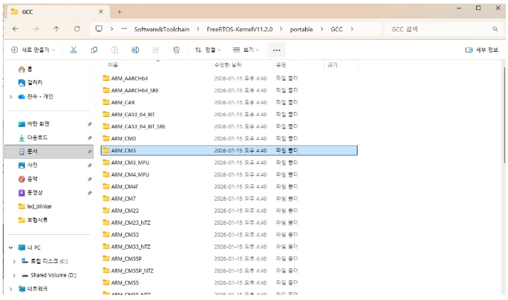 이제 GCC 안으로 들어가세요. 여기서 프로세서 아키텍처와 관련이 없는 모든 폴더를 삭제해야 합니다. 저는 Cortex-M3를 기반으로 하는 STM32F103 마이크로컨트롤러를 사용하고 있습니다. 따라서 ARM_CM3 을 제외한 나머지는 삭제해줍니다.