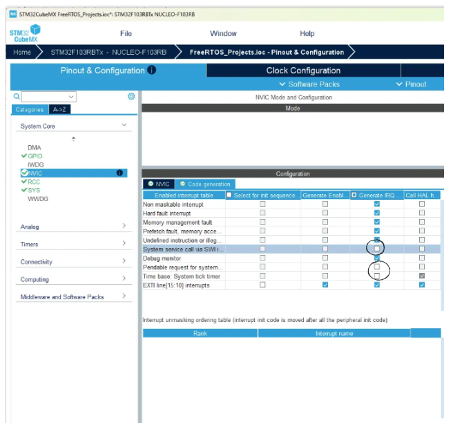 System Core로 이동하여 NVIC를 여세요. Code generation 탭을 클릭하고, Pendable request for system service, 즉 PendSV의 체크를 해제하세요. Time base: System tick timer와 System service call, 즉 SVC_Handler도 체크 해제해줍니다.