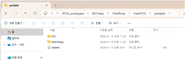 이제 portable을 복사해야 합니다. 일단 복사해서 붙여넣어줍니다. portable 안에 들어가서 필요없는 폴더를 삭제해야 합니다. 저희는 GCC를 사용하고 있습니다. 그래서 다른 컴파일러와 관련된 다른 모든 폴더를 삭제하면 됩니다. MemMange와 readme 는 남겨놓습니다. MemMange는 메모리 관리(Heap) 방식이 들어있습니다.