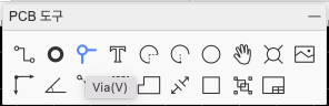 우리는 비아를 사용할 겁니다. 레이아웃에 비아를 배치하는 방법과, PCB의 하단 레이어에서 배선하는 방법을 배울 겁니다. 비아를 배치하려면 여기 있는 이 버튼을 사용하거나, 키보드에서 V 키를 누를 수 있습니다.