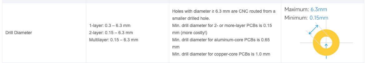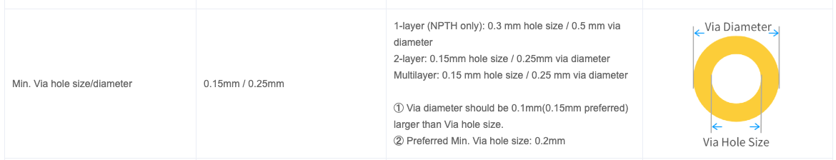 JLCPCB 웹사이트에 가서, 'Minimum Via hole size'(최소 비아 홀 크기)를 보면 다음과 같습니다.