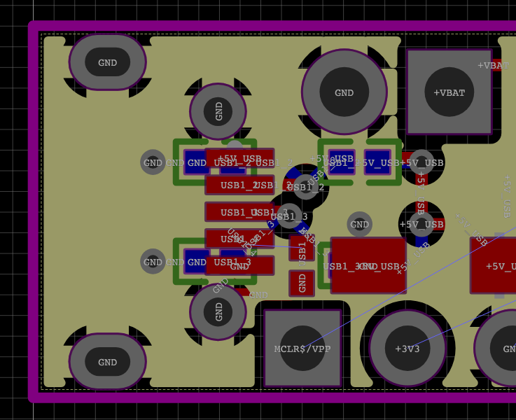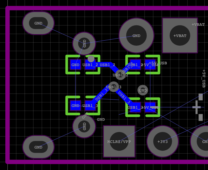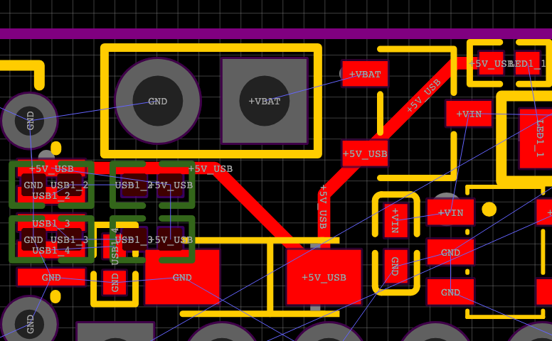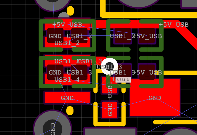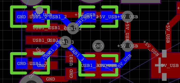 나머지 +5V USB 패드들을 연결하고 싶습니다. PCB의 탑 레이어에 배선된 +5V USB 넷에 연결해야 합니다. 그래서 비아를 사용해야 합니다. 키보드에서 V를 누르고 이미 배선된 이 트랙 위에 비아를 배치합니다.