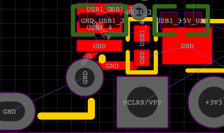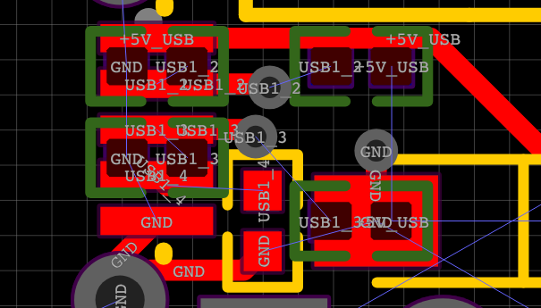 PCB의 하단 레이어로 넘어가기 전에, 이 영역의 모든 것이 상단에서 연결이 잘 되었는지 확인하고 싶습니다. 그리고 여기 있는 이 그라운드들을 연결하고 싶은데, 이것들을 USB 커넥터의 이 스루홀 패드에 연결할 수 있습니다.