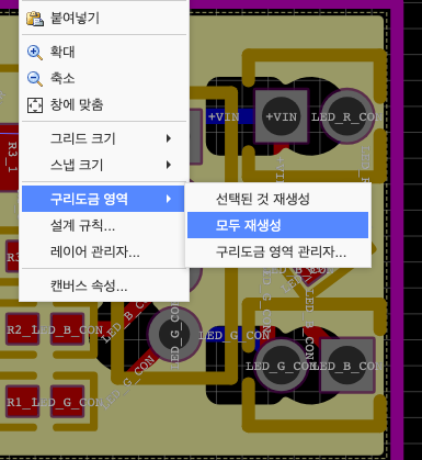 끝 부분의 PCB를 나중에 주 PCB에서 잘라낼 수 있도록 할 겁니다. 따라서 해당 영역까지 그라운드 플레인을 원하지 않습니다. 혹시 만약 부품 이동으로 GND 플레인 구리 도금이 이상해졌다면 다시 재생성하면 됩니다.
