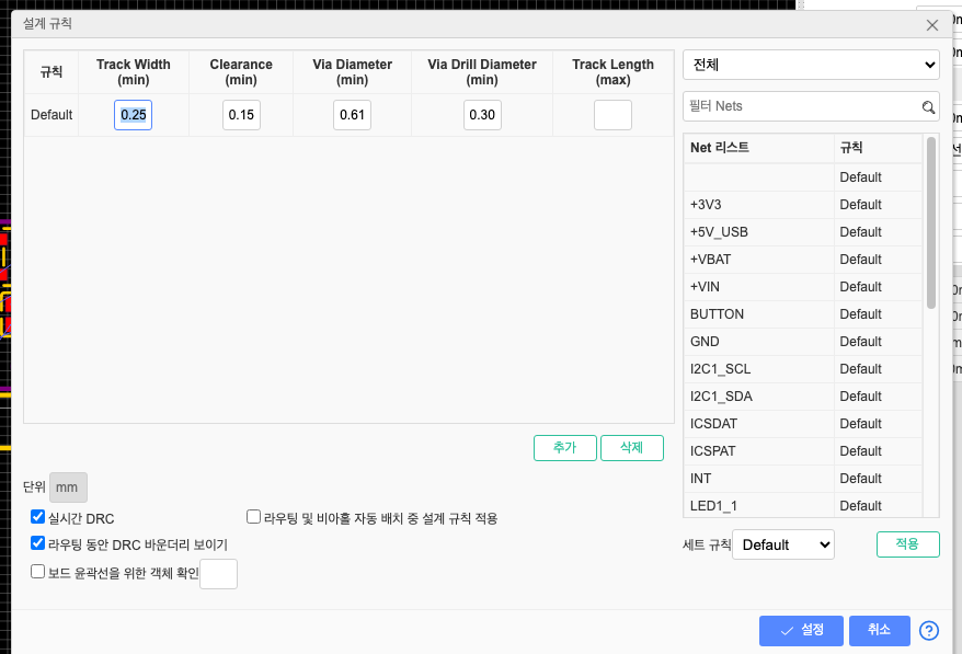 그리고 이것들이 기본 규칙입니다. 이것들은 기본적으로 우리가 PCB를 생성할 때 설정된 값들입니다. 이 기본 값들을 사용해도 됩니다.
