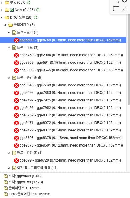 현재 트랙들 사이의 간격이 0.14mm~0.16mm 정도인데, DRC 규칙에서 요구하는 최소 간격 0.152mm보다 작음