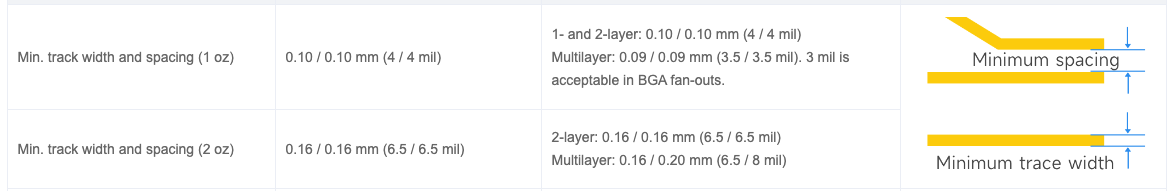 그리고 마지막으로 확인할 숫자는 최소 이격 거리(clearance)입니다. 이것은 PCB 상의 객체들 사이의 최소 공간 또는 최소 거리입니다. 예를 들어, 두 트랙 사이의 최소 공간은 0.15mm 입니다. spacing을 확인하면 됩니다. 간격이란 의미죠.
