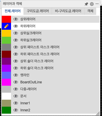 이제 PCB로 돌아가서 레이아웃을 시작할 수 있습니다. 특정 레이어에 그리려면 여기에 있는 이 패널을 사용할 수 있습니다.