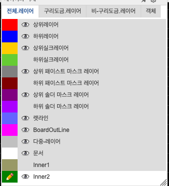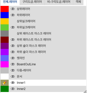 그러면 위에서 만든 GND 비아도 전부 여기 Inner 2 레이어에 연결이 되는거네요. 이렇게 만든 레이어는 다른 레이어 작업할 때 보기 어렵기 때문에 비활성화할 수 있습니다.