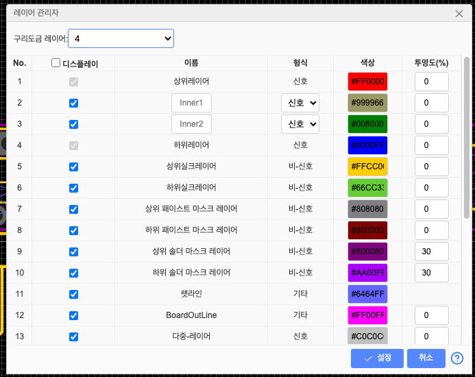 이제 우리 보드는 TopLayer, BottomLayer, Inner1, Inner2 를 갖게 됐습니다. 이 모든 레이어가 'Signal'(신호)로 설정되었는지 확인하고, 'Setting'(설정) 버튼을 클릭해주세요.