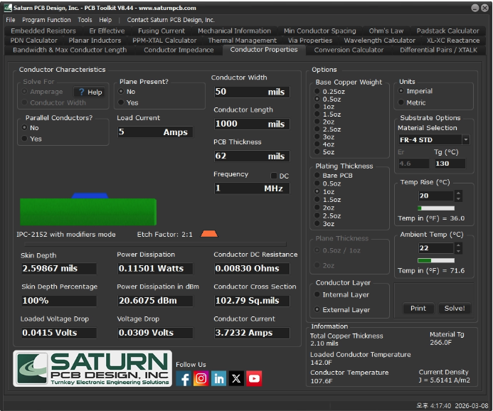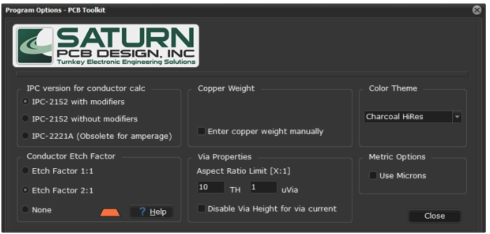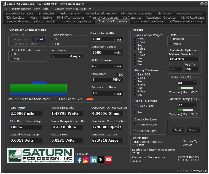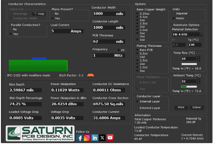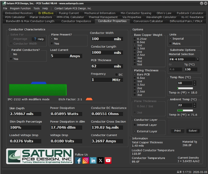 우리에게 유용한 도구가 있습니다. 이 프로그램은 Saturn PCB Design Toolkit 인데 무료로 다운로드 할 수 있습니다. 이것을 이용해 여러 상황에 대해 트레이스 계산을 해볼 수 있습니다.