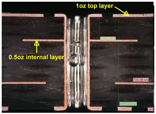 1온스 구리는 일반적으로 사용되는 표준 두께입니다. 하지만 멀티레이어 보드의 경우 내부 레이어에는 0.5온스 또는 심지어 0.25온스두께의 구리를 사용하는 경우도 많습니다. 그래서 만약 이를 따로 지정하지 않으면 실제로 어떤 두께의 구리를 받게 될지는 제조사에 따라 달라질 수 있습니다.