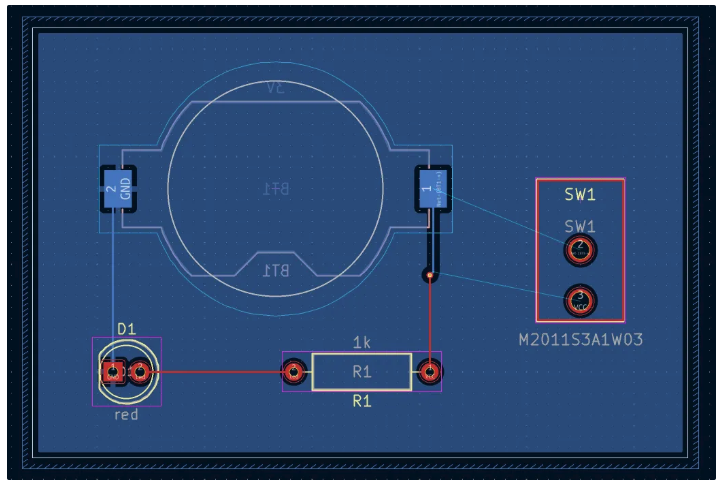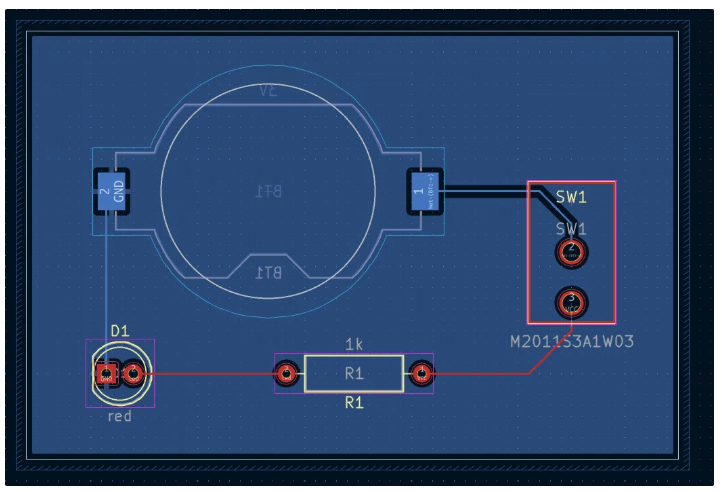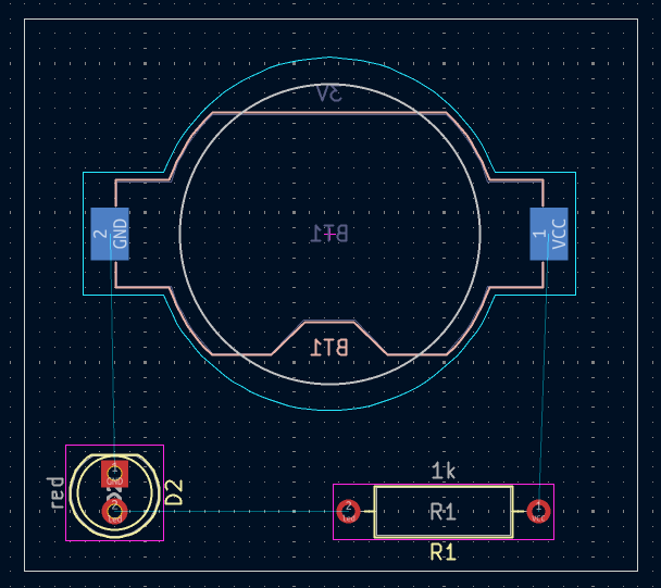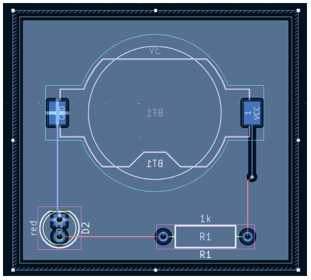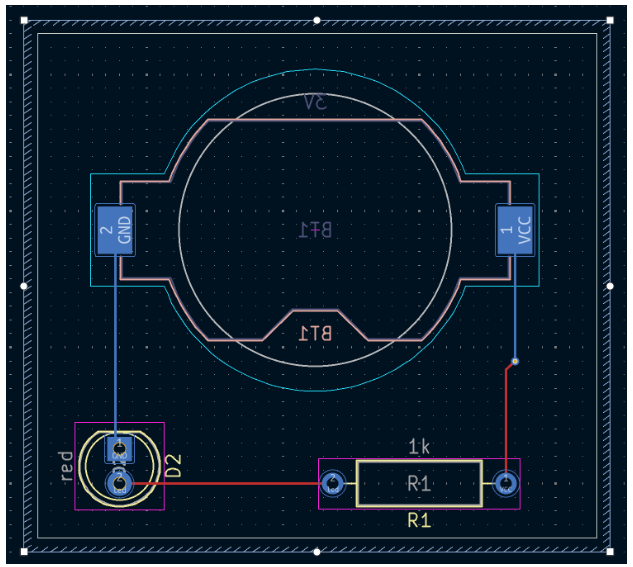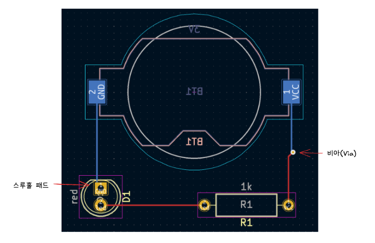 레이어를 연결하는 또 다른 방법은 비아(via) 를 사용하는 것입니다. PCB 뒷면(B.Cu)에 있는 BT1의 VCC 핀에서 배선을 시작합니다. BT1과 R1 사이쯤에서 키보드 V를 눌러 비아를 추가하면, 자동으로 PCB 앞면(F.Cu)으로 레이어가 전환됩니다. 즉, 배선이 뒷면 → 앞면으로 넘어갑니다. 그리고 PCB 앞면에서 R1의 VCC 핀까지 배선을 이어서 마무리하면 됩니다.