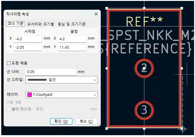 마지막으로 F.Courtyard 레이어를 선택합니다. Courtyard 윤곽선이 0.25mm의 간격을 두고 부품을 둘러싸도록 하려고 합니다. 풋프린트를 대략적으로 둘러싸는 직사각형을 그립니다. 직사각형을 선택하고 'E' 속성 편집을 클릭한 다음 직사각형의 모서리 좌표를 직접 입력합니다. 모서리 좌표는 다음과 같습니다.