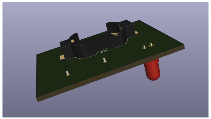 KiCad는 PCB 검사에 유용한 3D 뷰어를 제공합니다. "보기 → 3D 뷰어"를 선택하여 3D 뷰어를 엽니다. 마우스 가운데 버튼으로 위치를 이동시키고, 마우스 왼쪽 버튼으로 궤도를 바꿔볼 수 있습니다. 상단의 LED와 저항, 하단의 배터리 홀더를 확인해봅니다.