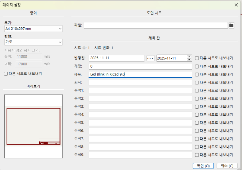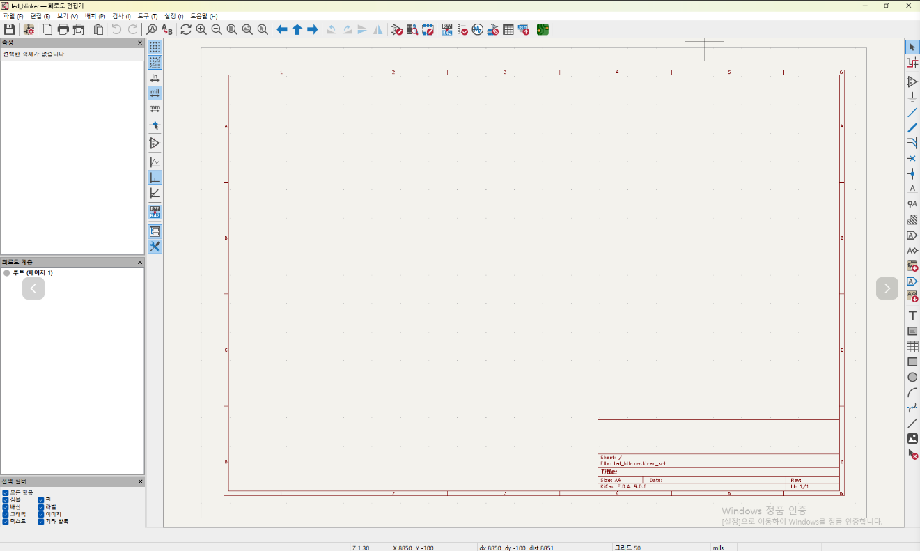 위와 같이 설정해주면, 회로도 시트 하단에 보면 제목과 날짜, 개정 번호가 나와 있는 것을 알 수 있습니다.