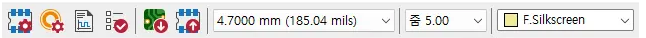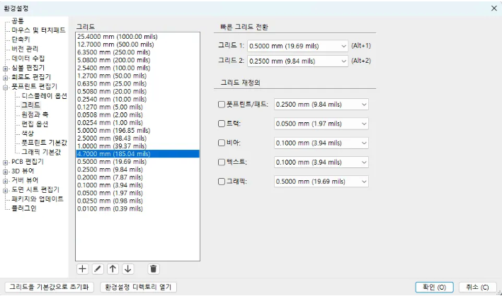 스위치에는 데이터시트에 2번과 3번으로 번호가 매겨진 두 개의 핀이 있으며, 핀 사이의 간격은 4.7mm입니다. 설치 편의를 위해 그리드를 패드 간격에 맞게 조정하십시오. 왼쪽 도구 모음의 "그리드 표시" 버튼을 마우스 오른쪽 버튼으로 클릭하고 "그리드 편집…"을 선택하여 그리드 설정을 엽니다.
