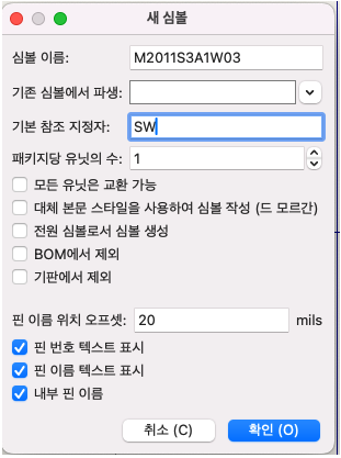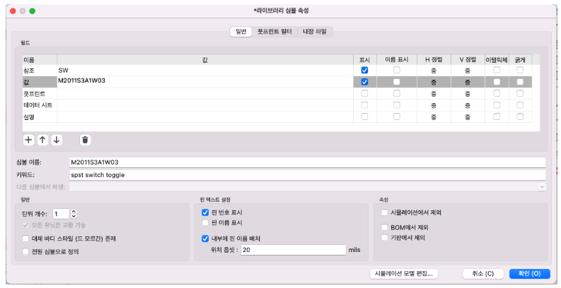 심볼 편집기 상위 구성 툴바에서 심볼 속성 클릭. 값 필드를 M2011S3A1W03로 변경하고 키워드 필드에 "spst switch toggle" 를 추가하여 검색을 통해 심볼을 더 쉽게 찾을 수 있도록 합니다. 이 심볼의 경우 핀 이름은 유용한 정보를 제공하지 않으므로, 핀 이름 표시 체크를 해제하여 심볼을 시각적으로 더 간결하게 만듭니다.