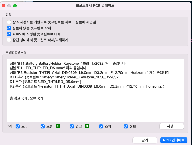 "적용할 변경 사항"의 메시지를 읽어 보세요. 회로도의 세 가지 구성 요소가 보드에 추가된다는 내용입니다. "PCB 업데이트"를 클릭해서 세 개의 풋프린트를 배치합니다.