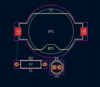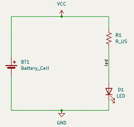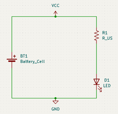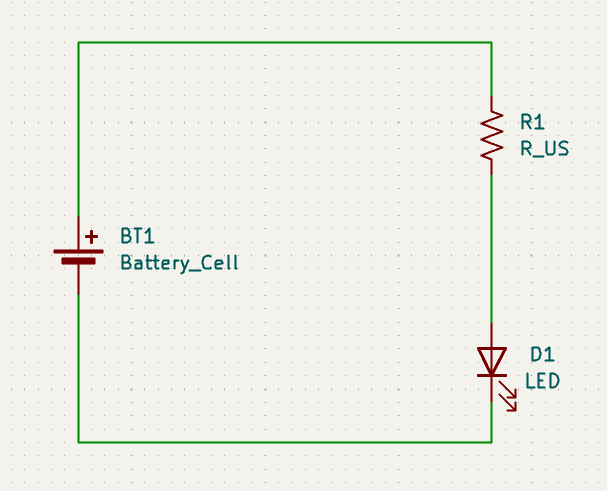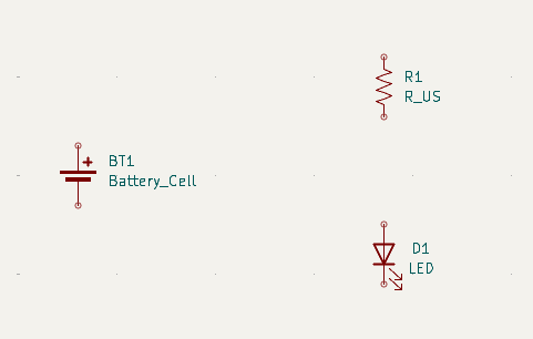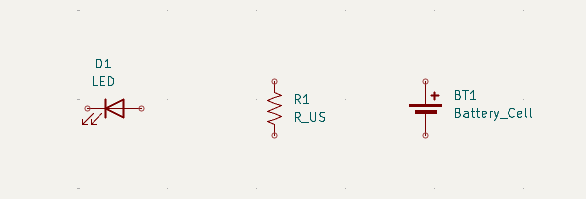 마지막으로 LED에 전원을 공급할 배터리를 추가하세요. Device 라이브러리에 Battery_Cell 라는 심볼이 있습니다.