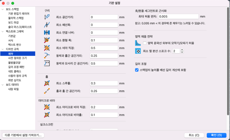 다음으로, "설계 규칙 → 제약 조건" 페이지로 이동합니다. 이 페이지의 설정은 보드 설계의 모든 항목에 적용되는 우선 설계 규칙을 지정합니다. 이 가이드에서는 기본값을 사용해도 괜찮습니다. 하지만 실제 프로젝트에서는 PCB 설계가 제조 가능하도록 PCB 제조 업체의 역량에 맞게 설정해야 합니다.