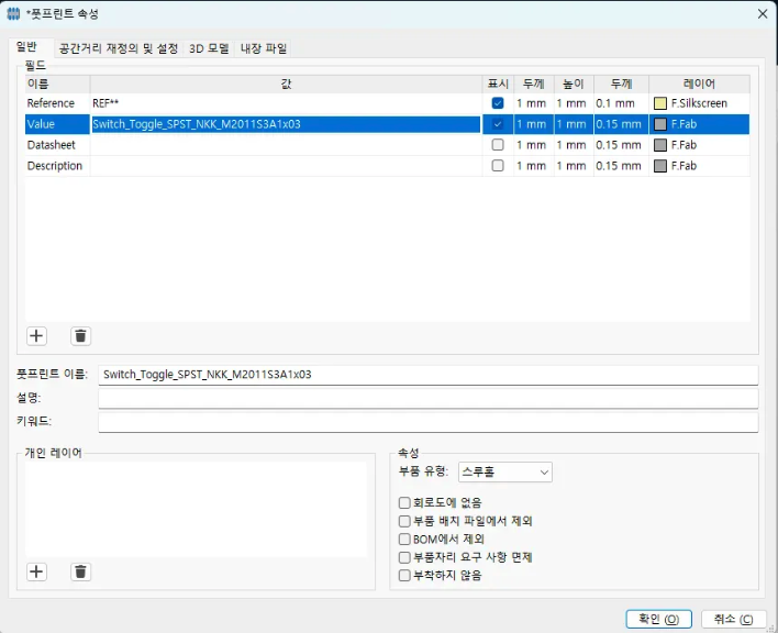 이제 풋프린트 작업이 완료되었으므로, 스위치 심볼을 수정하여 해당 풋프린트가 기본적으로 사용되도록 할 수 있습니다.