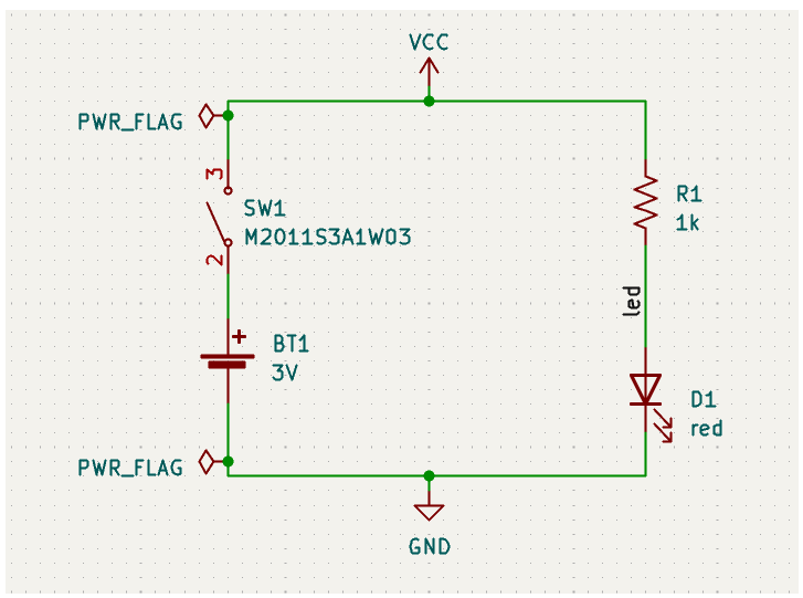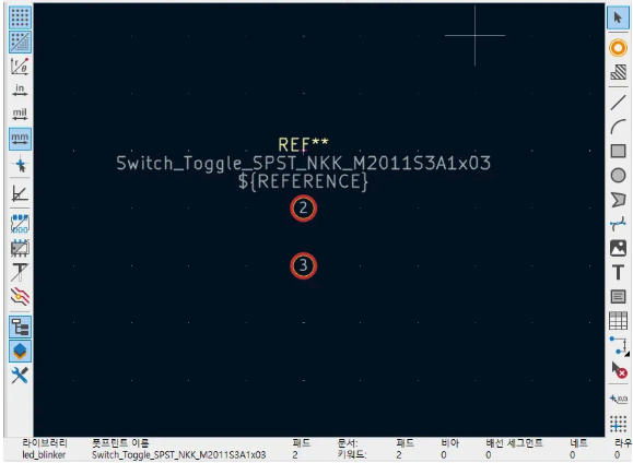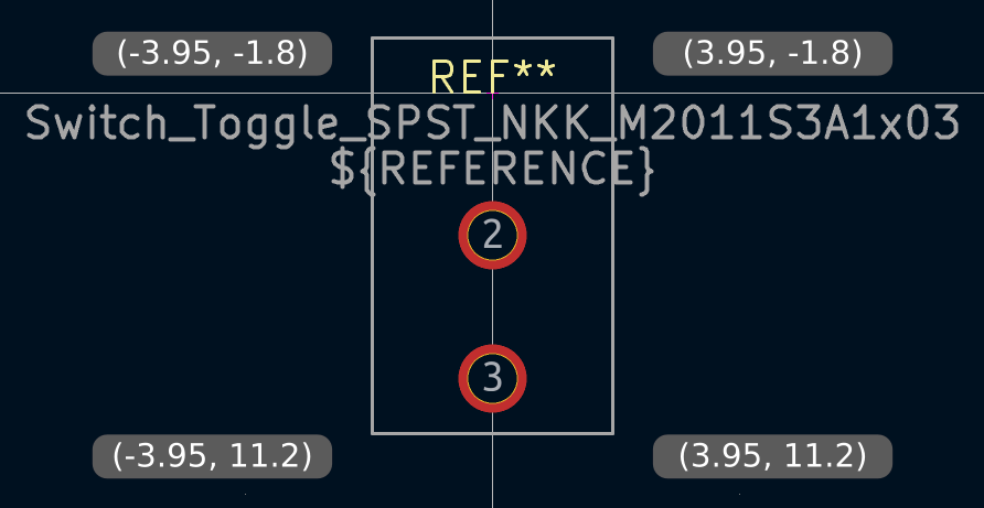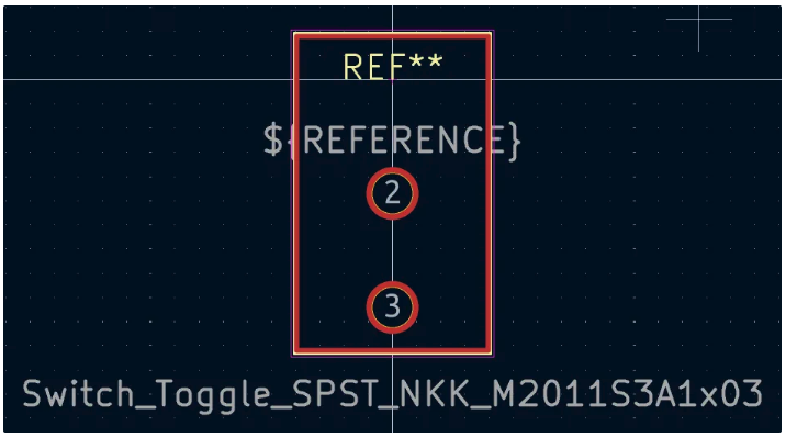 LED를 켜고 끄는 스위치를 추가하면 회로가 개선될 것입니다. 이 스위치를 추가하는 과정에는 스위치 심볼을 그리고, 스위치 풋프린트를 만드는 과정이 필요합니다. 이 가이드에서 사용할 특정 스위치는 SPST 토글 스위치인 "NKK M2011S3A1W03" 입니다. 다른 스위치도 사용할 수 있지만, 핀 번호와 풋프린트 크기를 조정해야 할 수도 있습니다.