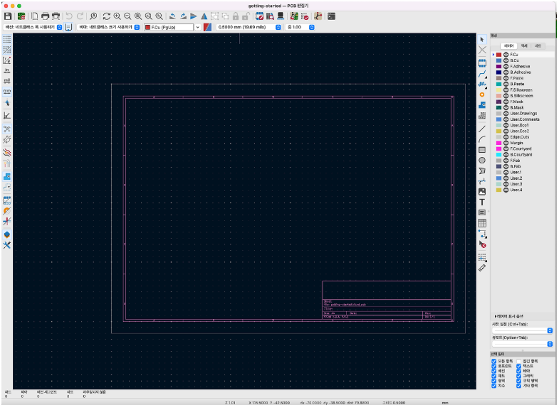 PCB 편집기의 주요 부분은 보드를 설계할 캔버스입니다.