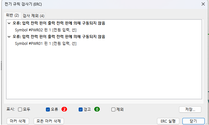 오류는 ERC 창에 나열되어 있으며, 회로도에서는 화살표로 위반 위치를 가리킵니다. ERC 창에서 위반 사항을 선택하면 해당 화살표가 강조 표시됩니다.
