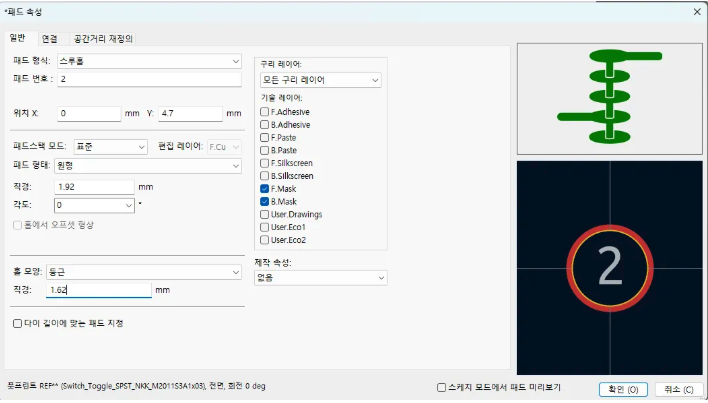 스위치 핀의 크기는 1.17mm x 0.8mm이므로 대각선 길이(핀의 최대 크기)는 1.42mm입니다. 따라서 구멍 직경을 1.42mm + 0.2mm(여유) = 1.62 mm 로, 패드 직경을 1.62mm + 2 * 0.15mm(양쪽 테두리) = 1.92 mm 로 설정하여 충분한 환형 공간을 확보합니다.