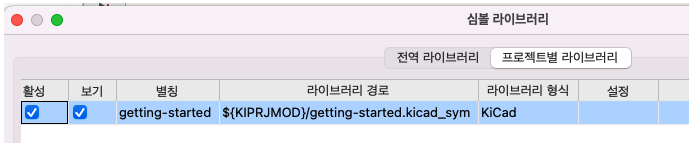 전역 심볼 및 풋프린트 라이브러리 테이블 외에도 프로젝트 라이브러리 테이블이 있습니다. 전역 테이블에 추가된 심볼과 풋프린트는 모든 프로젝트에서 사용할 수 있는 반면, 프로젝트별 테이블의 심볼과 풋프린트는 해당 프로젝트에서만 사용할 수 있습니다. 사용자는 전역 라이브러리 테이블 또는 프로젝트별 테이블에 자신의 라이브러리를 추가할 수 있습니다.