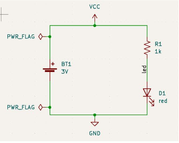 KiCad에서 이런 문제를 해결하기 위해 PWR_FLAG 특수 심볼을 제공합니다. 이 심볼을 VCC, GND 넷에 추가하고 다시 실행하세요. 이러면 KiCad이 “이건 공급되는 전원입니다” 라고 이해하게 됩니다. ERC가 위반 사항 없이 통과하면 회로도가 완성됩니다.