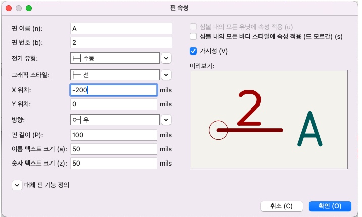 회로도에서 와이어(배선)도 50 mil 그리드를 기준으로 그려지기 때문에, 핀이 이 그리드에 맞지 않으면 와이어가 핀에 제대로 연결되지 않는 문제가 발생합니다.