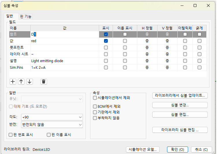심볼 속성은 각 구성 요소의 값을 의미합니다. 예를 들어, LED를 선택하고 마우스 오른쪽 버튼을 클릭한 후 속성(E)를 선택합니다(혹은 심볼을 더블클릭). 이 프로젝트에서는 빨간색 LED를 사용하므로 value 필드를 "red" 로 변경합니다.