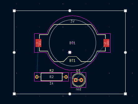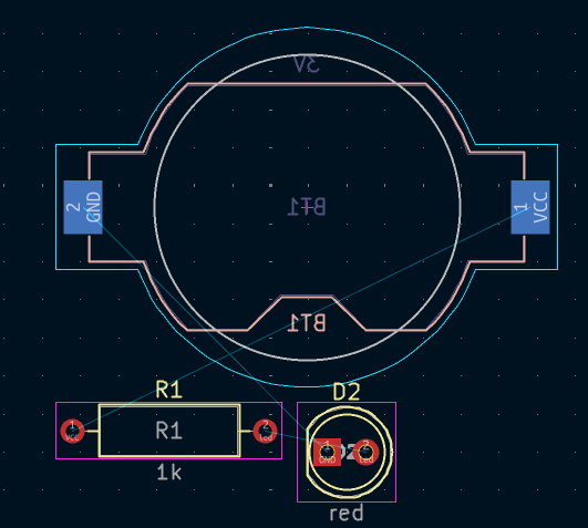 BT1 배터리 홀더를 보드 뒷면으로 옮겨 보세요. 클릭해서 선택한 다음, M을 눌러서 옮깁니다. F를 눌러 반대쪽으로 뒤집으면, 이제 배터리 홀더가 거울처럼 보이고 패드 색상이 빨간색에서 파란색으로 바뀌었습니다. (헉..!)
